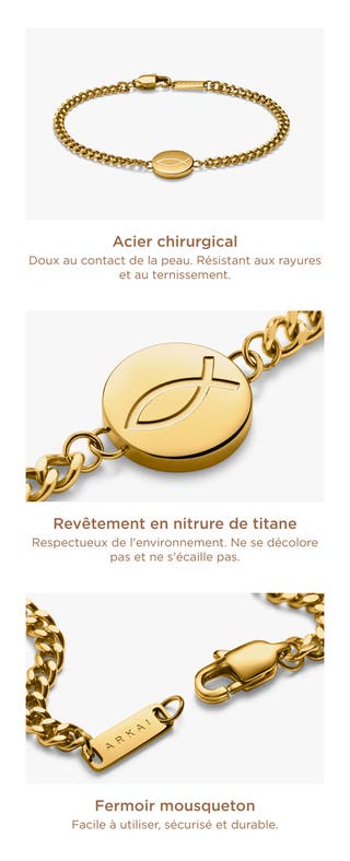 Ce bracelet en acier inoxydable 316L présente une finition dorée, sobre et soignée. La chaîne à maillons et le petit médaillon ovale sont finement travaillés pour une silhouette épurée. Un petit poisson gravé ajoute un détail discret sans alourdir le bracelet.