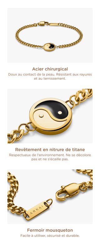 Fabriqué en acier inoxydable 316L avec une finition dorée polie, ce bracelet affiche un disque yin et yang discret au centre. La chaîne fine a des maillons arrondis et serrés pour un profil soigné, et le motif noir et doré apporte un contraste subtil. Le bracelet est équipé d'un fermoir à mousqueton et d'une petite plaque d'identité pour une fermeture sûre et propre.