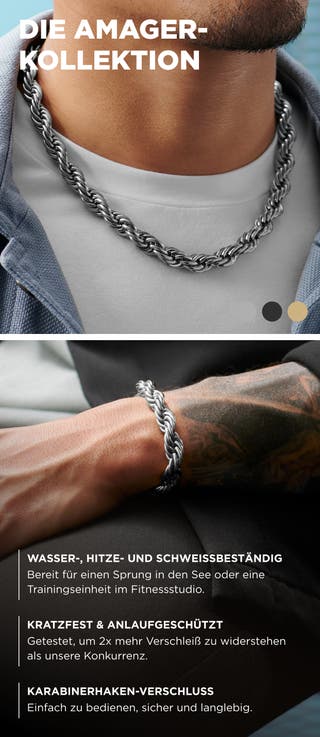 Allein getragen wirkt die Kette durch die Seilstruktur dezent und maskulin. Beim Schichten mit anderen Halsketten sorgt sie für Kontrast und mehr Präsenz. Der schwarze Edelstahl passt zu lässigen Hemden oder einem einfachen T‑Shirt und gibt dem Alltagslook eine leicht kantige Note. Oberfläche und Gliederform halten die Silhouette klar und gut kombinierbar mit anderen Teilen.