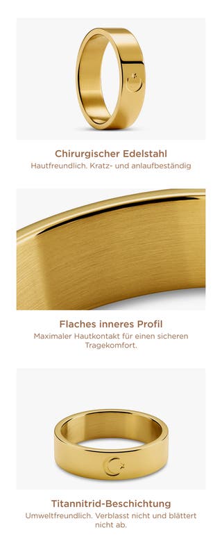 Dieser Ring besteht aus 316L‑Edelstahl mit goldfarbener Oberfläche. Er hat eine schmale Ringschiene und ein schlichtes, modernes Design. Auf der polierten Außenseite ist ein präzise gravierter Halbmond mit Stern. Die gebürstete Innenseite und die abgerundeten Kanten sorgen für einen bequemen Sitz. Die goldfarbene Optik und das zurückhaltende Profil lassen sich gut mit anderen Ringen kombinieren.